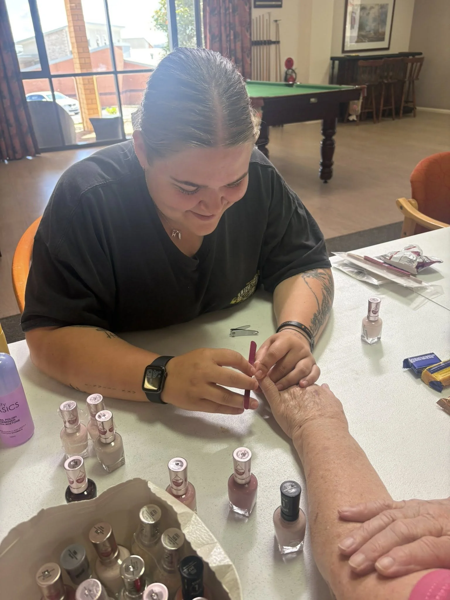 Staff always find time in their day to make each resident feel not only well cared for, but individually special. Charlie gave Roma a little nail makeover today. Every day is a day to feel glamorous here at Currawarna Assisted Living!